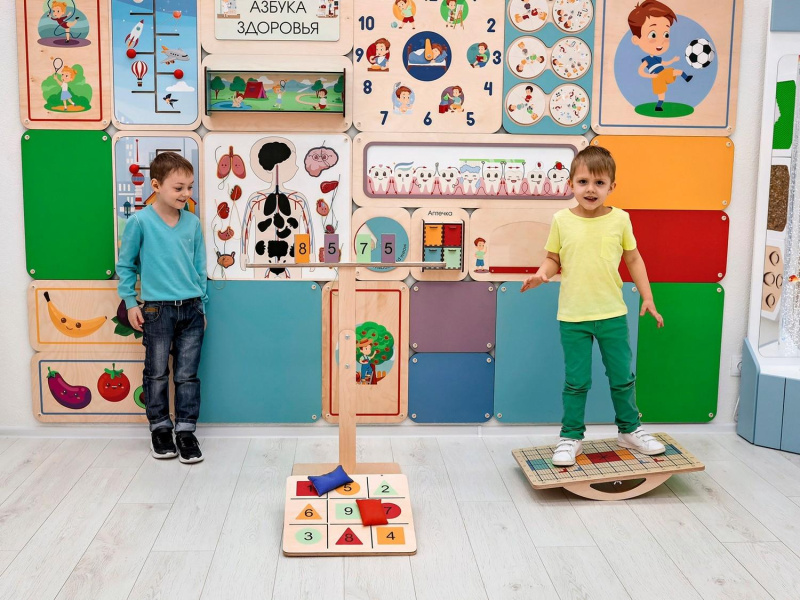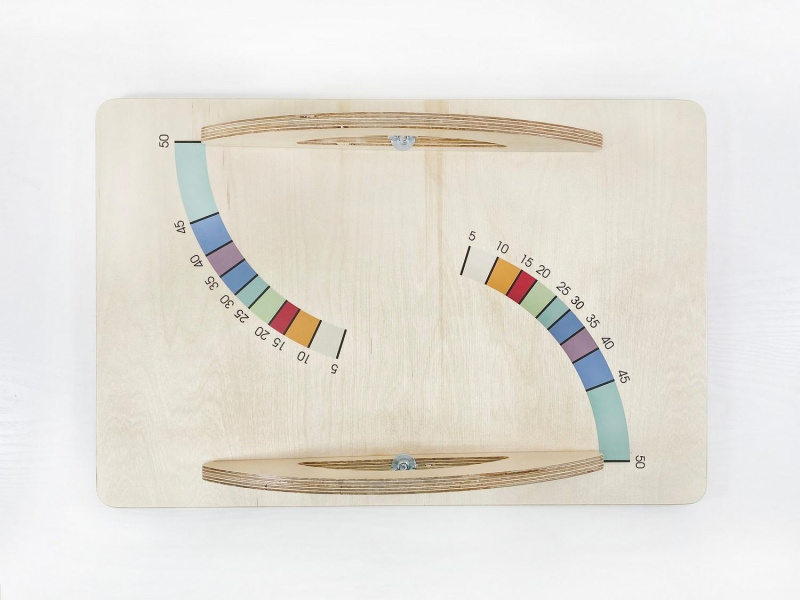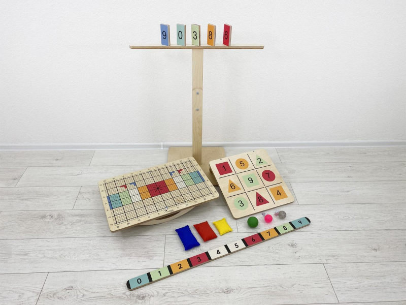 Балансир изготовлен из прочной экологичной фанеры, не имеет острых углов, о которые можно травмироваться. Изделие хорошо отшлифовано и покрыто огнезащитным лаком, стойким к загрязнениям и истиранию. В комплекте идёт набор дополнительного инвентаря для занятий, методическое пособие и универсальный ключ для поворота полозьев.